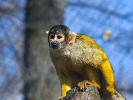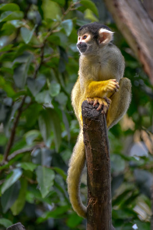 Portrait of squirrel monkey Saimiri sciureus sitting on a tree branch.
