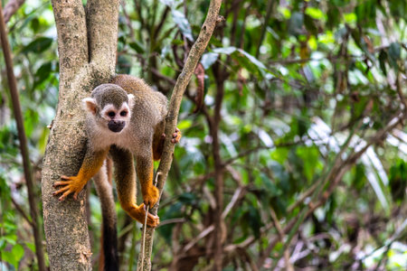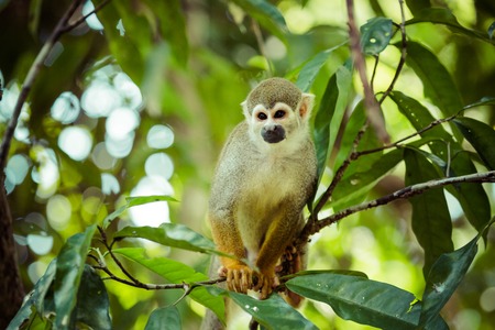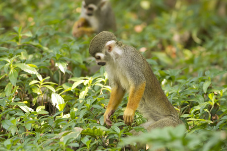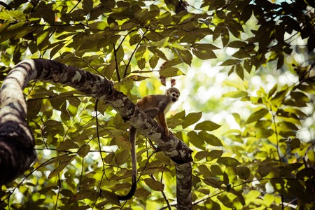 Squirrel monkey in natural habitat, rain forest and jungle, playing and moving around