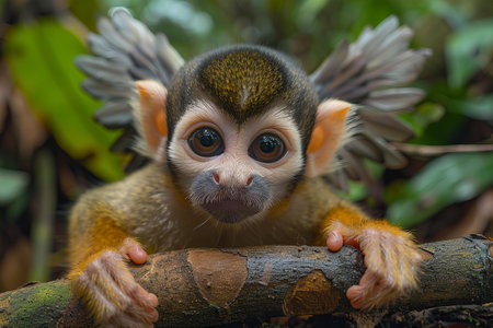 Detailed close-up of a squirrel monkey amid lush green foliage with dewdrops. the monkey's expressive eyes and vibrant fur create a captivating and intimate wildlife scene, ideal for nature-themed projects, educational materials, or wildlife photography collections. Generative AI
