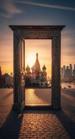 A stunning view of St. Basil's Cathedral in Moscow through an ornate doorway at sunset