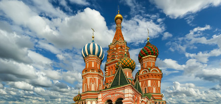 MOSCOW, RUSSIA - JUNE 9, 2023: St. Basil's Cathedral on Vasilievsky Descent on Red Square on a sunny day against a bright blue sky. A popular tourist attraction in Moscow.