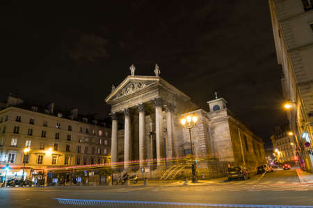 PARIS - SEPT 17, 2014: Night view of the south facade of the Church Notre-Dame-de-Lorette. It is a neoclassical church in the 9th arrondissement of Paris, France.