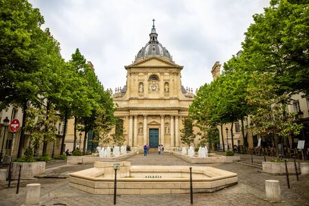Paris, France - 24.04.2019: Sorbonne square and College de Sorbonne, founded in 1257 by Robert de Sorbon as one of the first colleges of medieval University, Paris, France