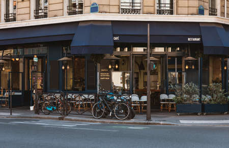 Typical view of the Parisian street with tables of brasserie (cafe) in Paris, France
