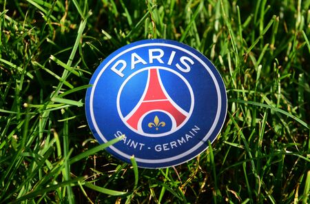 September 6, 2019 Istanbul, Turkey. The emblem of the French football club Paris Saint-Germain F.C. on the green grass of the football field.