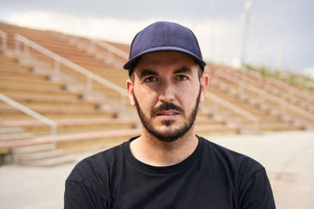 Outdoor portrait of a Hispanic man looking at the camera seriously. Close-up of a young man's face wearing a cap. Concept of people and emotions. Black t-shirt.