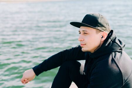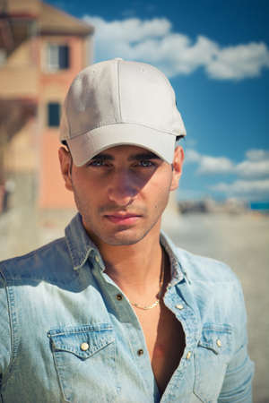 Handsome young, man in denim shirt and baseball cap sitting at beach