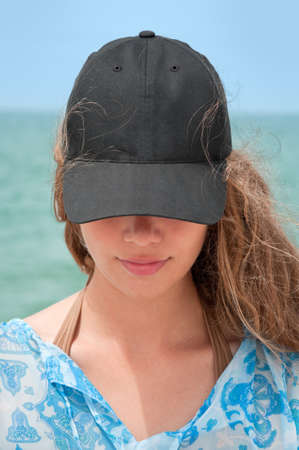 Girl with black baseball cap and curly hair