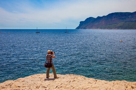 Tourist with a photo bag photographed landscape. Bays of the Mediterranean Sea and the Cote d'Azur. Calanques are the attractions of Provence. French. The concept of photo tourism