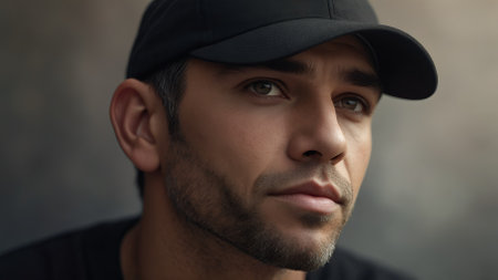 Close-up portrait of a thoughtful man with a black cap, light stubble, and soft gaze, conveying introspection.