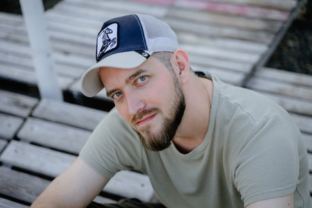 Young man in the dark cap looking at camera standing on the background of a lake