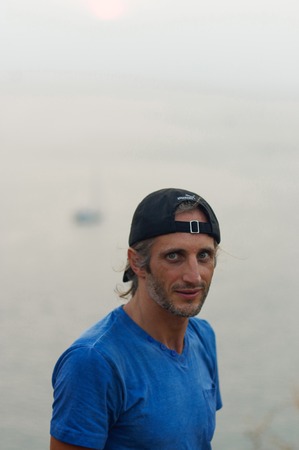 Portrait of a young man in cap on the beach - at sunrise