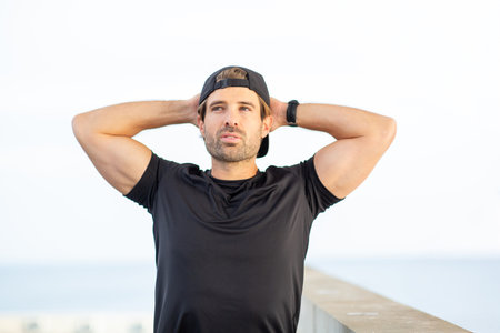 Close-up of a man in a black t-shirt and cap resting with arms behind his head near a concrete wall, with a bright sky and ocean in the background