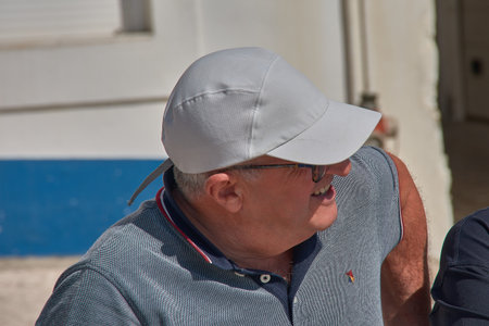 A middle-aged man appears smiling and relaxed, wearing a light gray cap and dark sunglasses, along with a blue-toned polo shirt. His contented expression suggests he's enjoying a sunny day outdoors. The image, with good lighting and focus on his face, is ideal for depicting concepts related to senior lifestyle, vacations, sun protection, travel, and wellness.