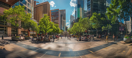 A city skyline with a bright blue sky and clouds. The city is bustling with activity and people are walking around