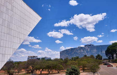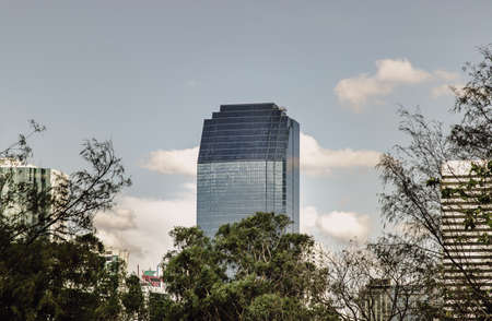 Bangkok, Thailand - Feb 19, 2022 : View of Modern high buildings among green trees space in nature against blue sky with clouds at afternoon. City growth concept, Selective focus.