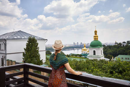 Woman in hat with scarf looking to the church with golden domes at Kiev Pechersk Lavra Christian complex. Old historical architecture in Kiev, Ukraine