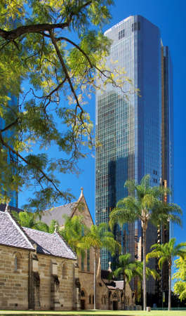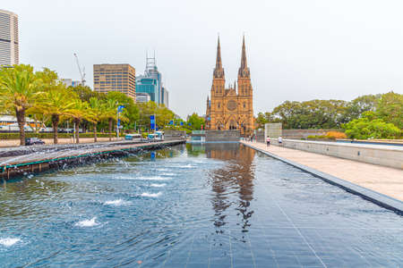 St Mary Cathedral view with Sydney CBD skyscrapers on the background. Sydney, Australia