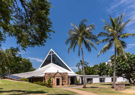 Darwin Australia - February 22, 2019: White Modern pyramid shaped building of Christ Church Anglican Cathedral set in green park with palm trees under blue sky.