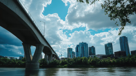 A stunning view of a modern bridge spanning calm waters with a city skyline in the background. Dramatic clouds add depth to the bright blue sky.