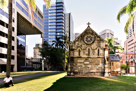 Facade view of the historical Christ Church Anglican Church, built in 1926 in English Gothic style with prominent bell tower and spire on Woongarra Street in Bundaberg, Queensland, Australia