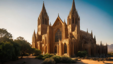 Gothic cathedral surrounded by trees, faithful and stained glass., generative AI