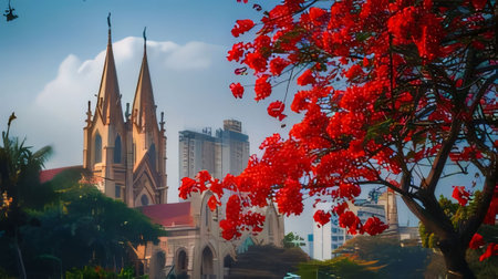 Red flowers on a tree in the background green of the tree and a tall cathedral. Flowering flowers, a symbol of spring, new life. A joyful time of nature awakening to life.