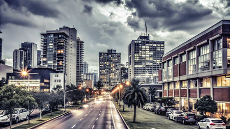 An urban scene depicts a city street lined with trees and buildings under a cloudy sky. The composition showcases a road leading towards the city center. The image has a natural lighting and visual characteristics, suitable for various editorial and commercial applications.