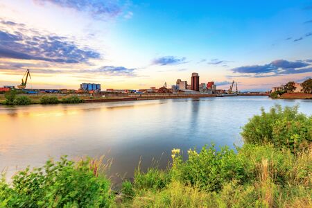 Ice drift in Northern Dvina river in Arkhangelsk, Russia. Beautiful ice motion evening landscape