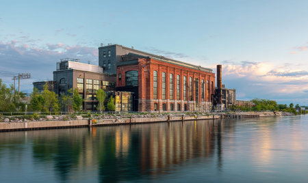 A large brick building with a large chimney sits on the water. The building is surrounded by a body of water