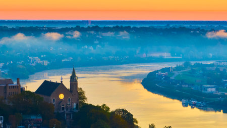 Aerial of Cincinnati Church and Ohio River at Sunrise
