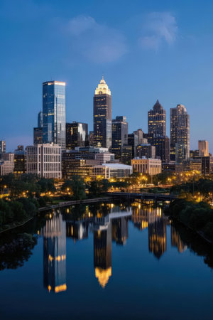 The beauty of the Harrisburg City Skyline at Dusk with the city lights coming on from across the Susquehanna River.