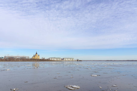 Nizhny Novgorod, Russia. - March 24.2017. Oka's watery expanse. In the distance one can see the Cathedral of Alexander Nevsky and the construction of a football stadium