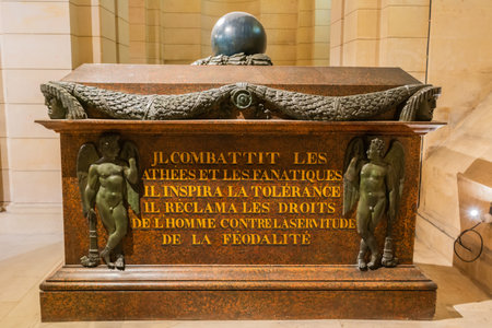 Paris, France – October 1, 2017. The tomb of French writer and philosopher Voltaire (1694-1778) in the crypt of Pantheon in Paris.