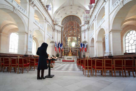 Inside Cathedral of St. Louis (cathedrale Saint-Louis-des-Invalides), famous so that it is buried Napoleon, in Paris, France, woman puts candle
