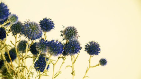 blue round flowers of thistle on light background, copy space