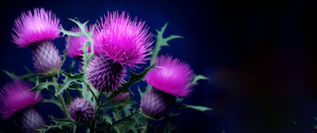Milk Thistle or silybum, herb with anti-inflammatory propertie on dark blue background. Banner. Generative Ai content.