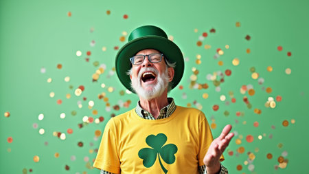 Elderly caucasian male celebrates st. patrick's day with shamrock shirt and green hat.