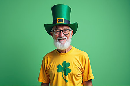 Elderly caucasian male in green top hat with shamrock shirt celebrating st. patrick's day.