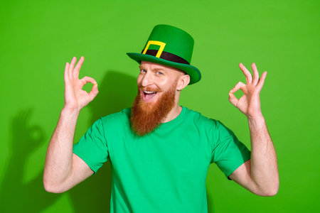 Portrait of excited funky guy hands fingers show okey approve symbol isolated on green color background