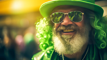 A cheerful middle-aged man wearing green sunglasses dressed as a Leprechaun at a St. Patrick's Day parade. AI generated.