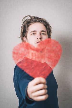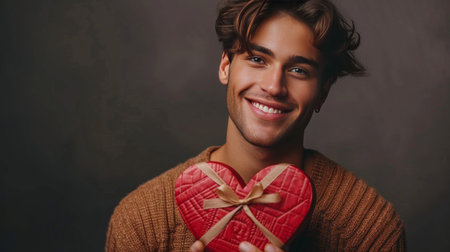 Young handsome guy holding a red heart-shaped box with a bow in his hand.