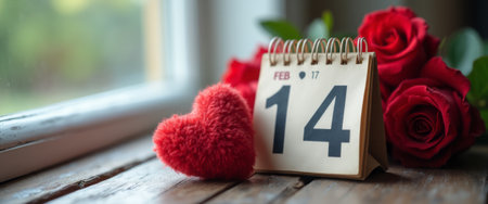 A charming scene captures a small calendar displaying February 14, surrounded by vibrant red roses and a plush heart, all resting on a rustic wooden surface. The soft natural light streaming through the window enhances the romantic atmosphere, evoking feelings of love and warmth perfect for Valentines Day.