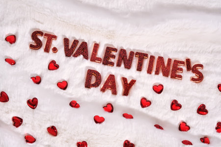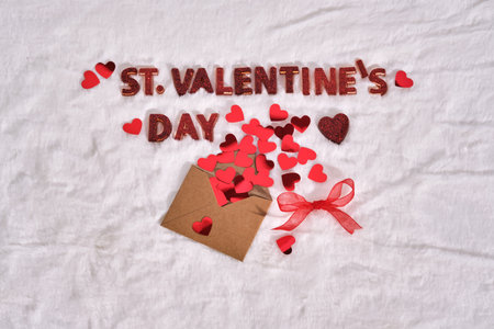 Valentines Day background with handmade red textile hearts,red ribbon and roses. White background flay lay pattern top view copy space