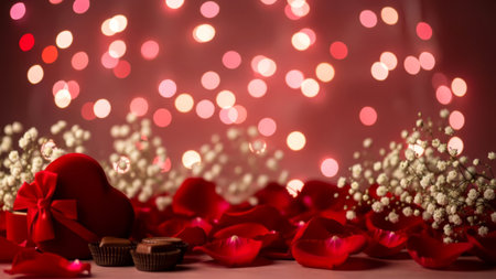 Valentine's Day background with heart gift box, chocolate, rose petals and bokeh lights for love concept.