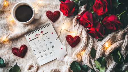 A cozy and romantic arrangement featuring coffee, a calendar for Valentine's Day, beautiful roses, and heart decorations. Perfect for celebrating love!