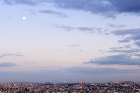 Dusk settling in over Paris, seen from Mont Martre. The last rays of sunlight striking the buildings of Paris