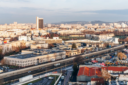 Paris, France - 23 February 2025: Industrial and residential cityscape of Asnieres-sur-Seine, panoramic view of buildings, factories, warehouses, roads, and modern apartments in Paris suburbs