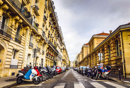 Typical street view from paris with beautiful classic buildings in this wonderful european destination on a bright sunset