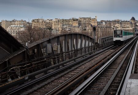Train tracks and train with buildings in the background, paris